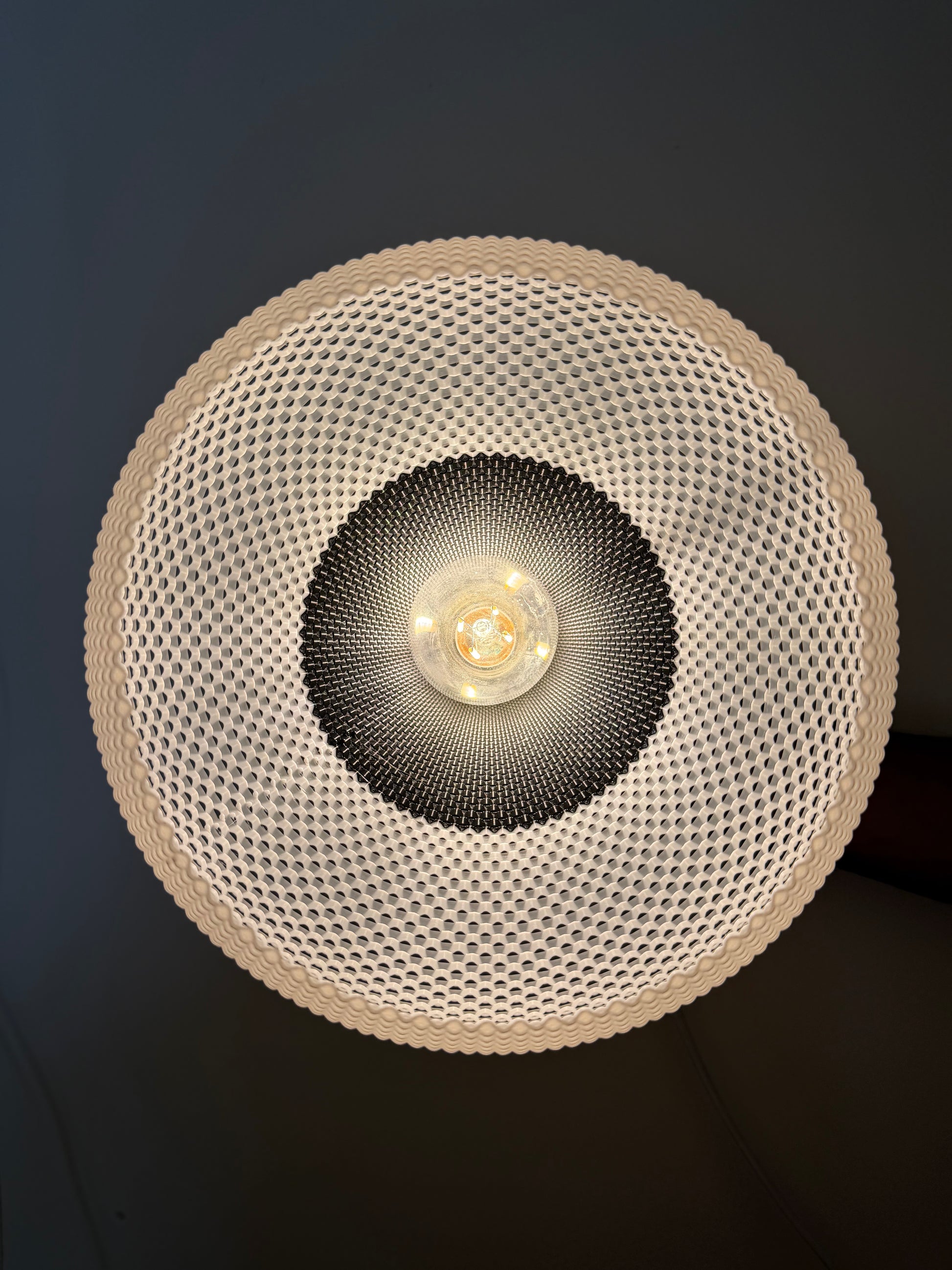 Inspired by the natural geometry of a honeycomb, this lamp blends structured design with a warm, inviting glow. The repeating hexagonal pattern wraps seamlessly around its curved form, creating a striking play of light and shadow when illuminated.